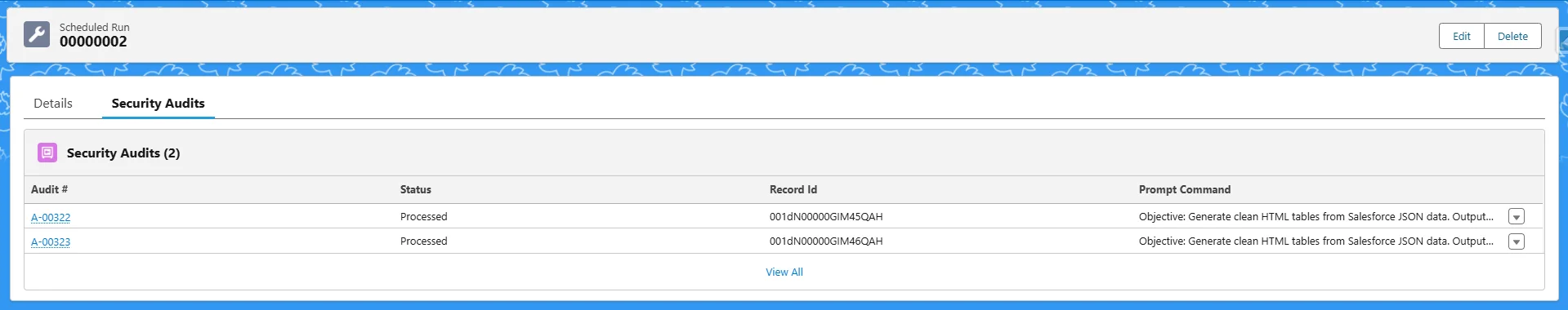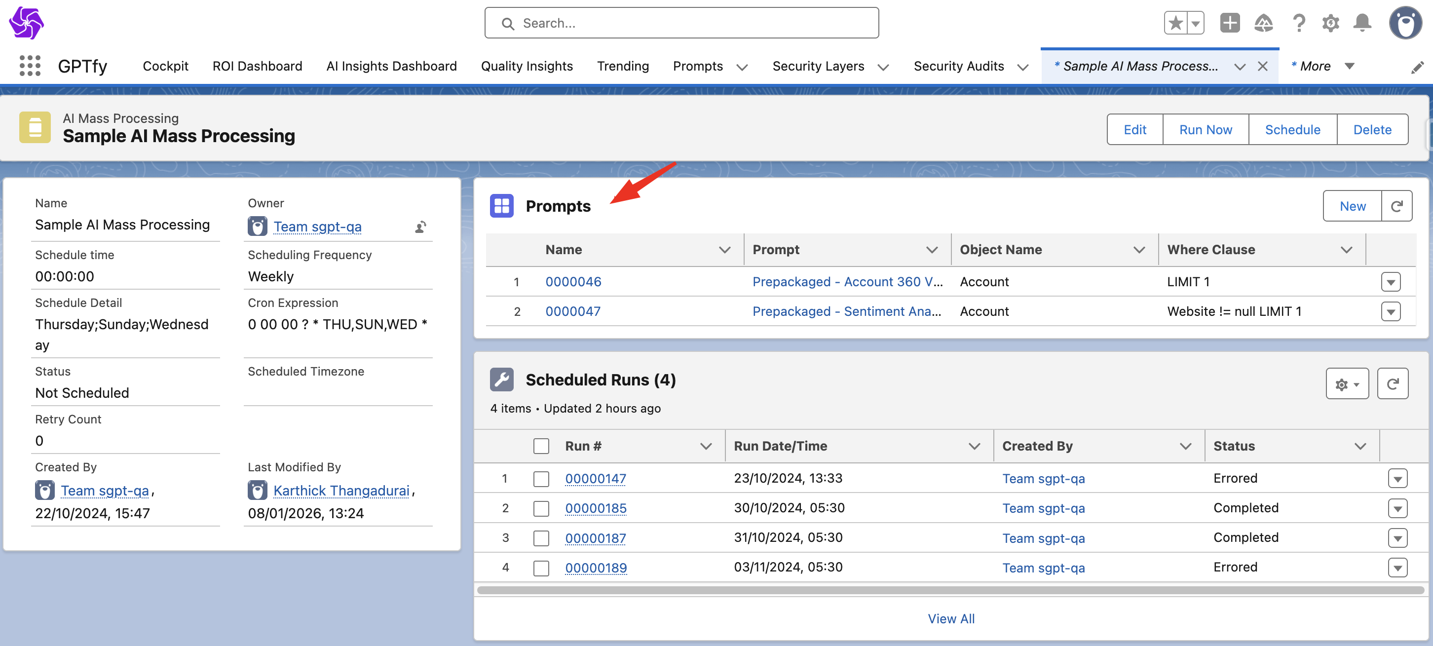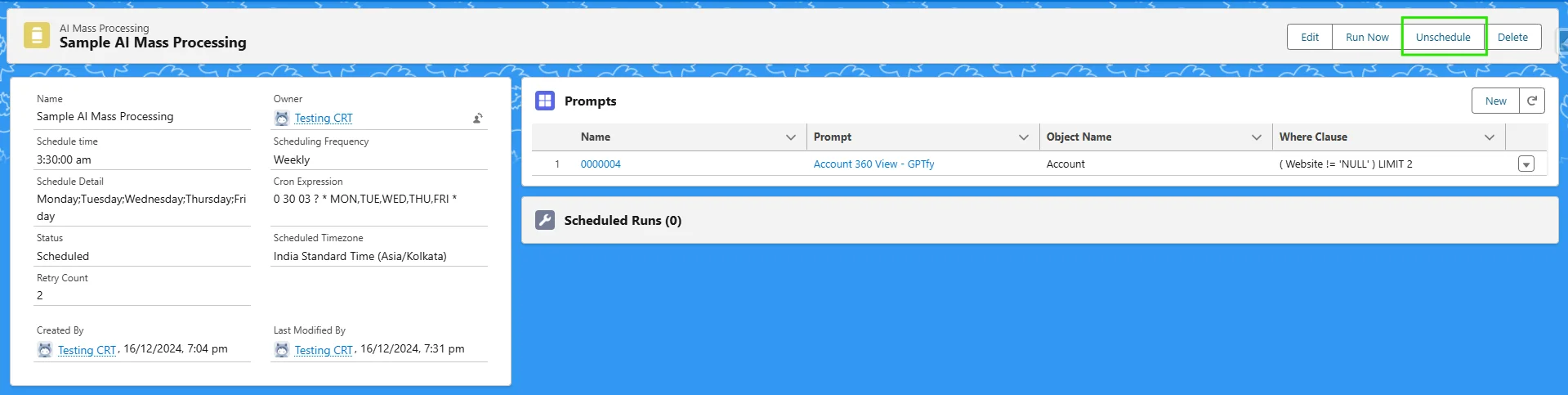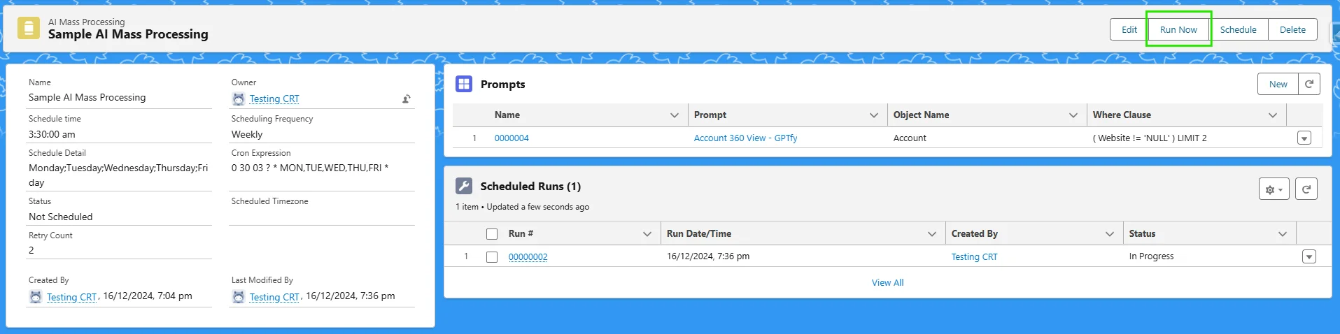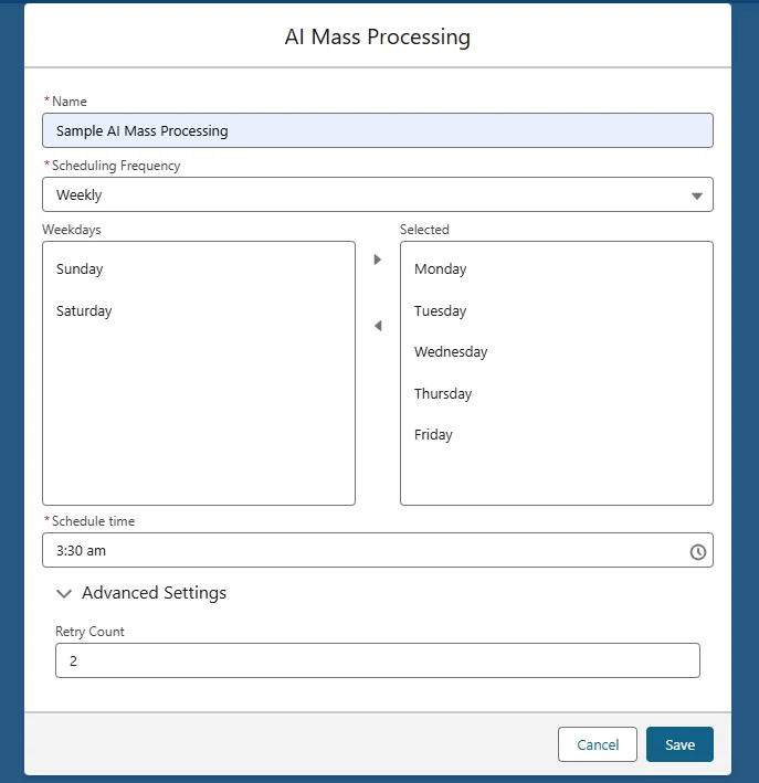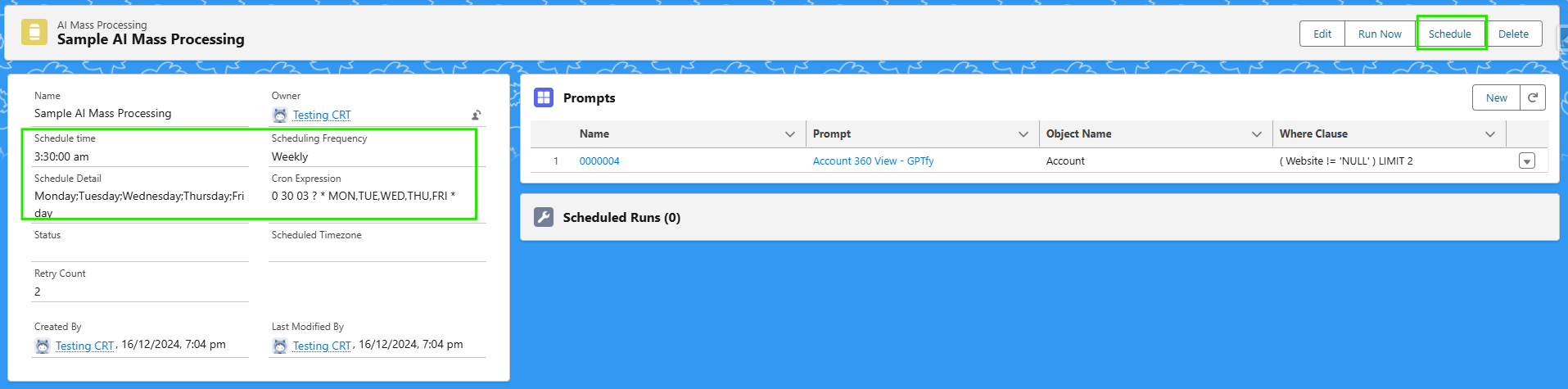 Each AI Mass Processing record contains one or more prompt schedulers. These define which records to process and what prompts to run.