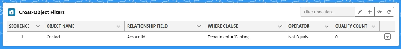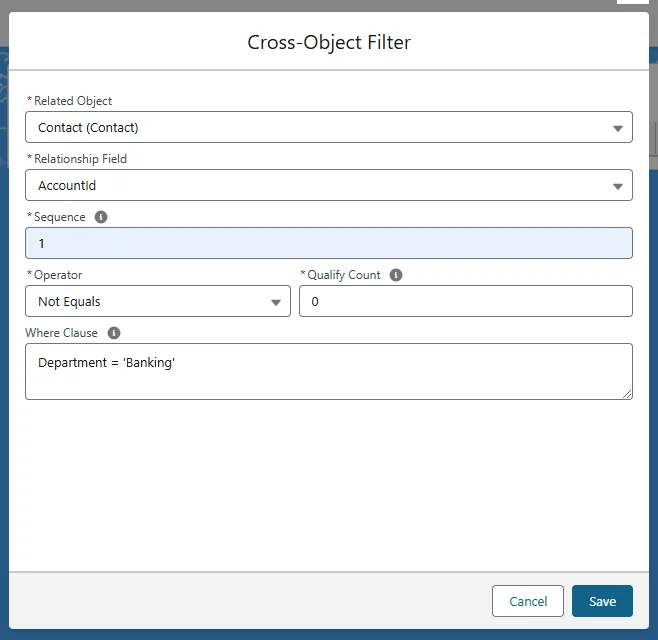 Example: To process an Account only if it has a related Contact with Department = 'Banking', define a COFi filter on Contact.