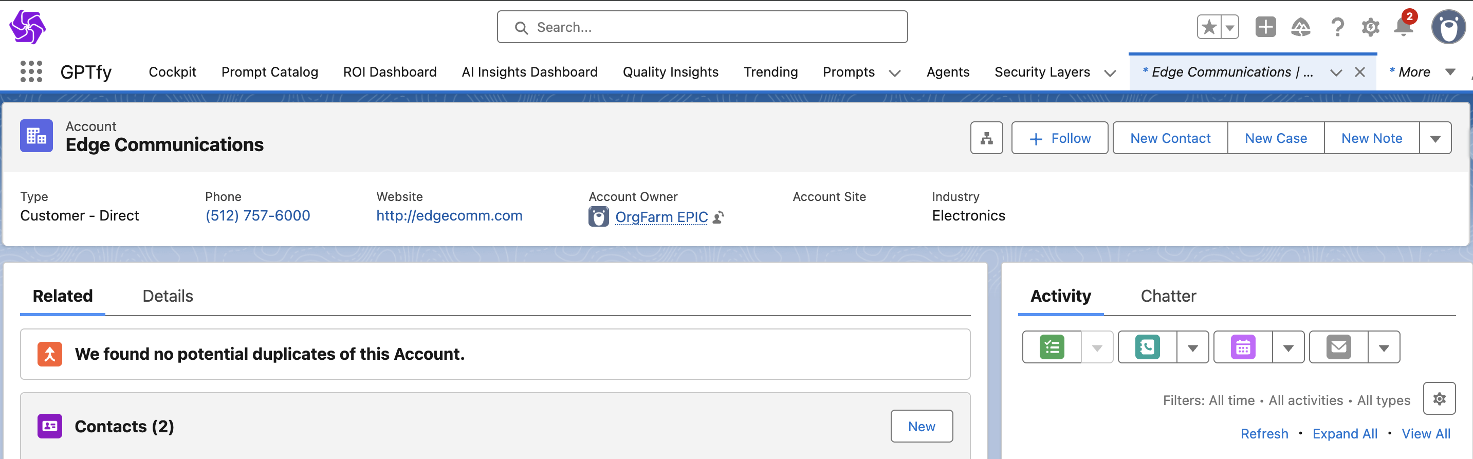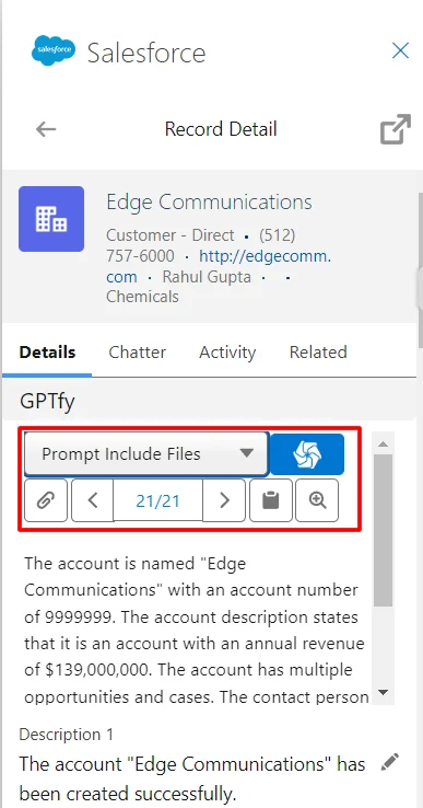 - Active prompts are visible in the GPTfy console by opening any Account record, and the user can run those prompts.