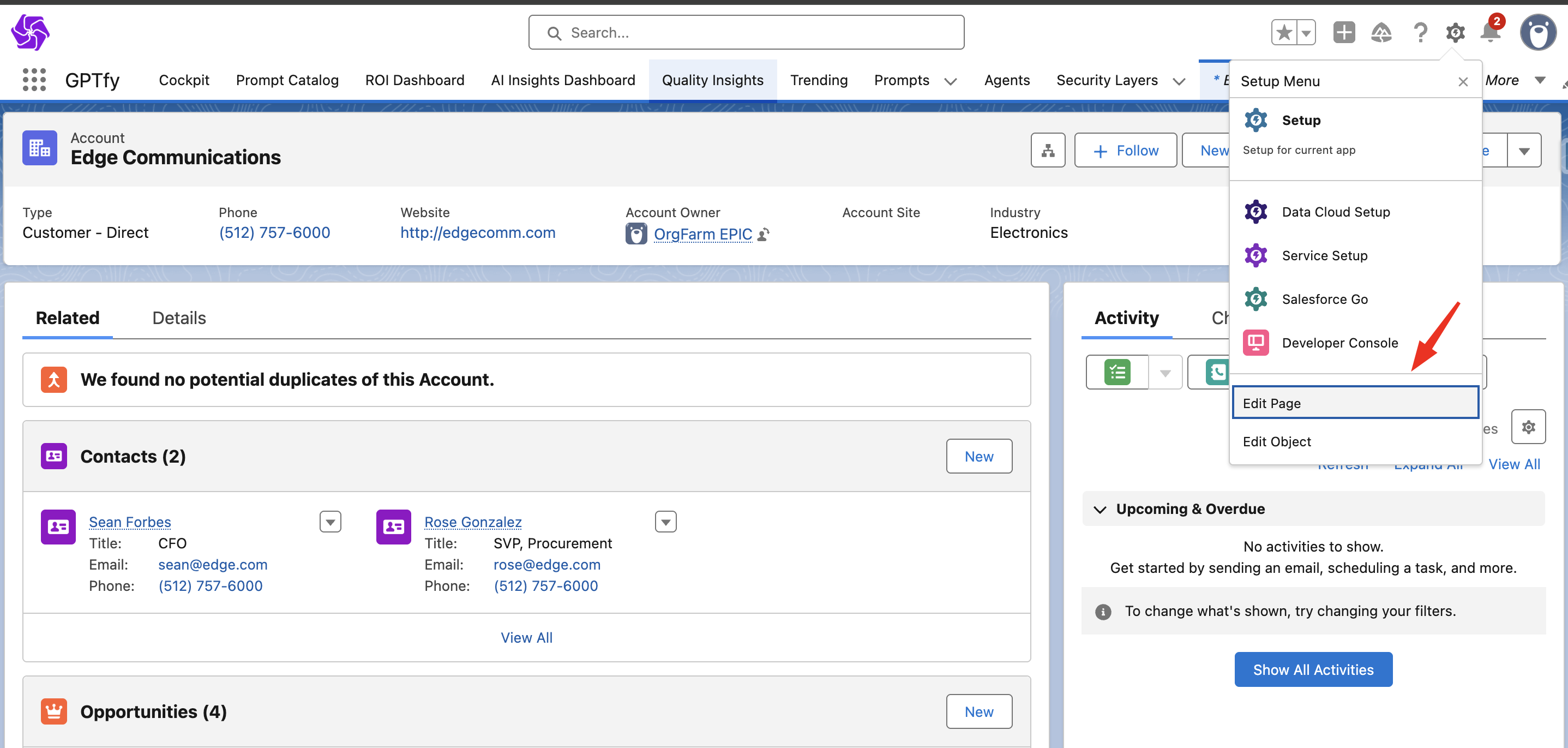 - From the dropdown menu, select “Edit Page.” This action will launch the Lightning Page Editor.