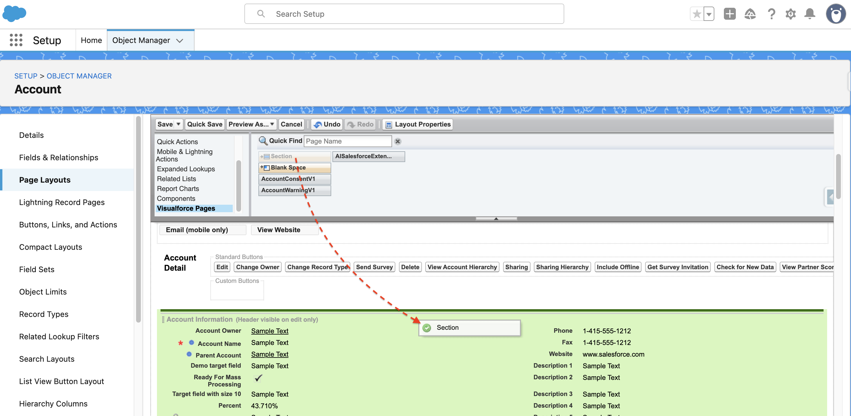 - Drag and drop the ‘AISalesforceExtensionAccountVF’ onto the newly created section.