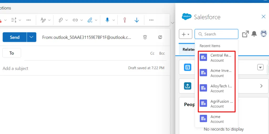 - Salesforce org is now connected with Outlook; you can view Account records!