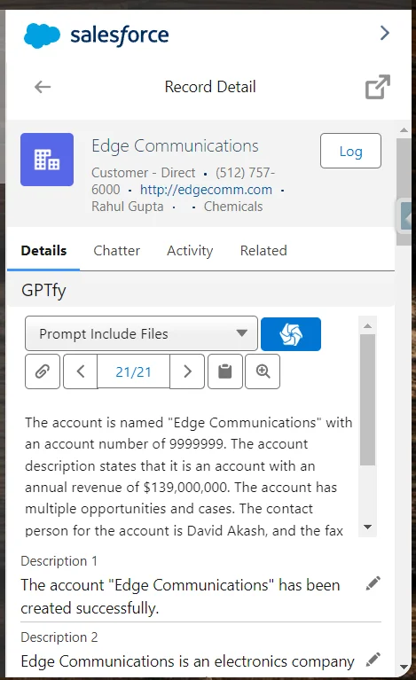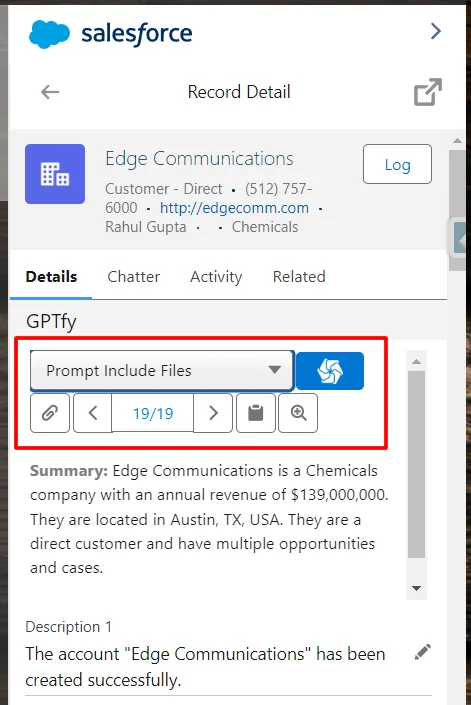 - Open any account record, GPTfy console will be visible on the record page section created above.