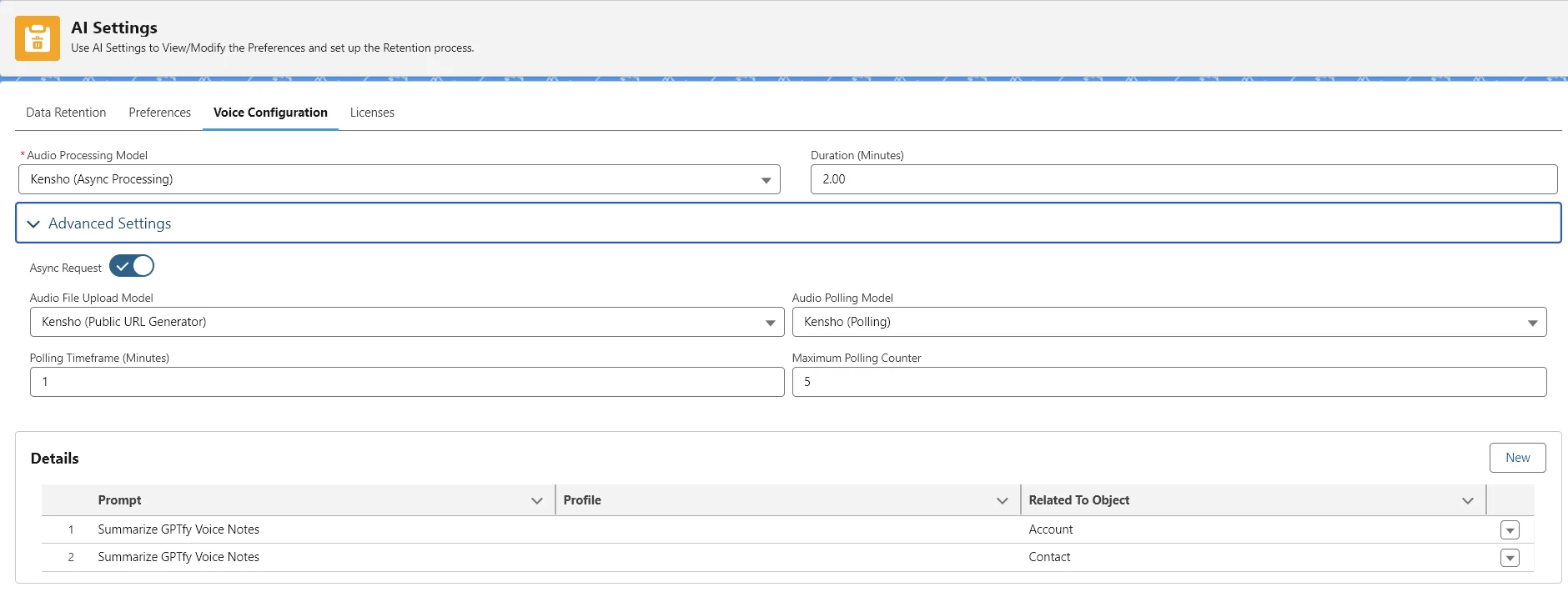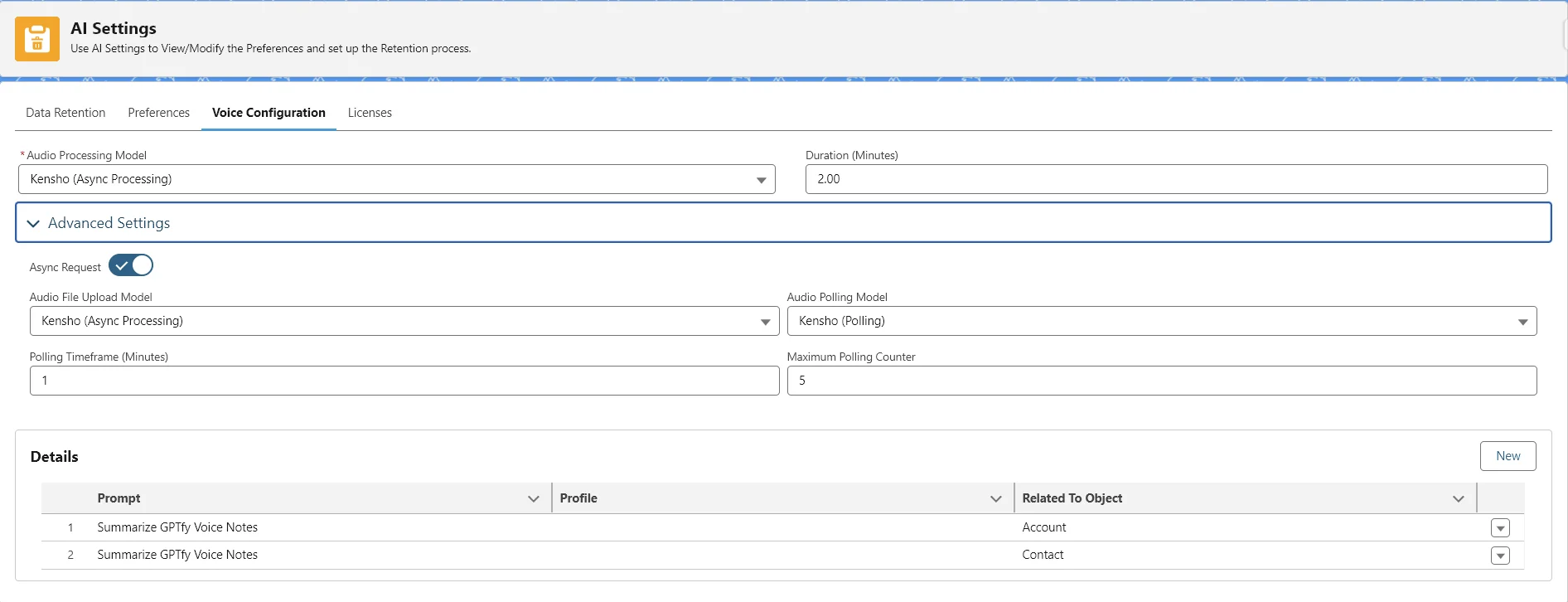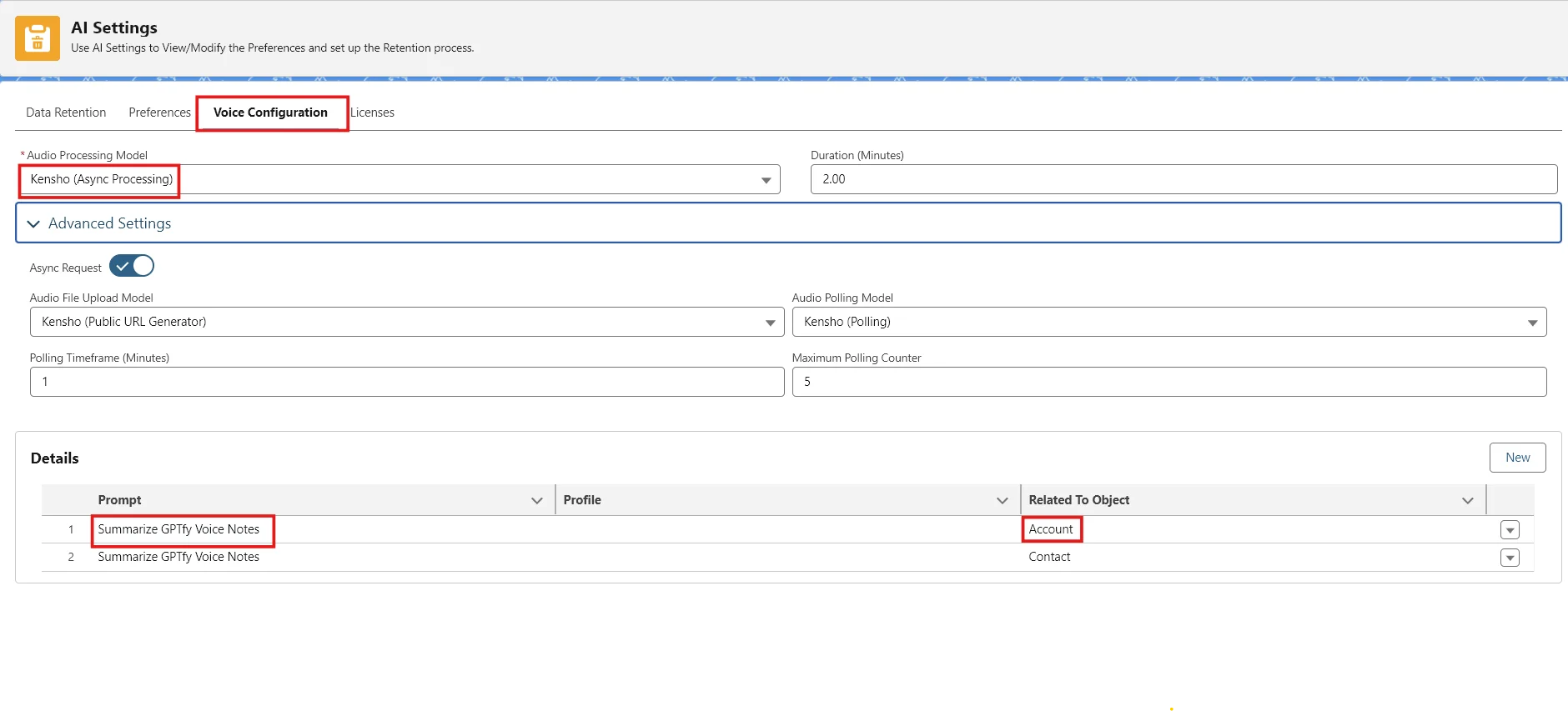 - Once all three Kensho models are activated in the AI Model, add them to the Voice Configuration settings under AI Settings.