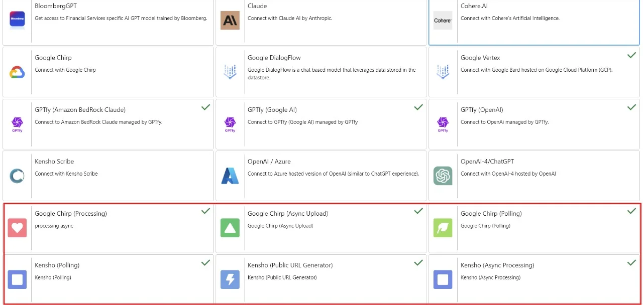 - Google Chirp AI model or Kensho must be activated. Refer to the related article for configurations and settings.