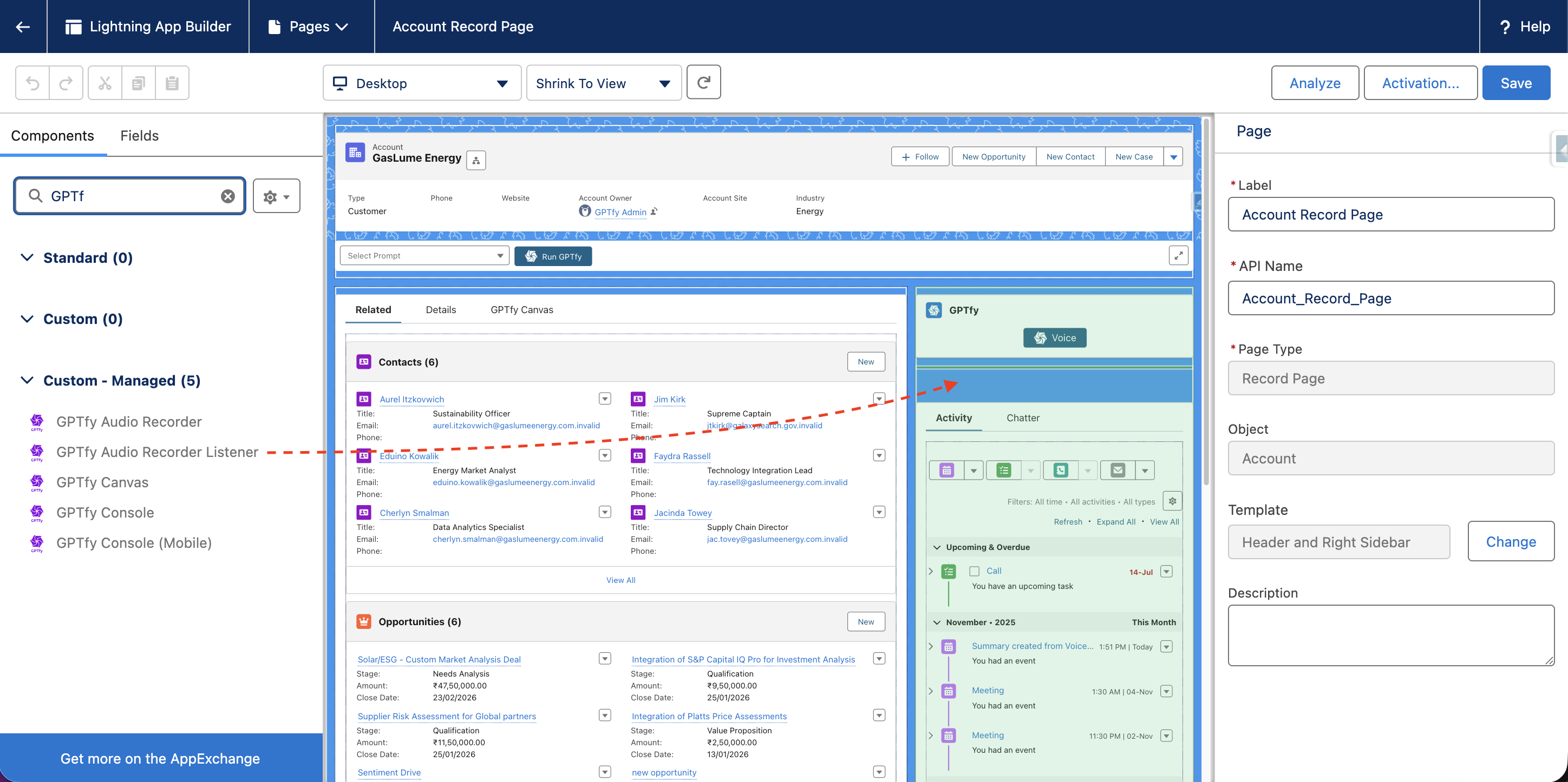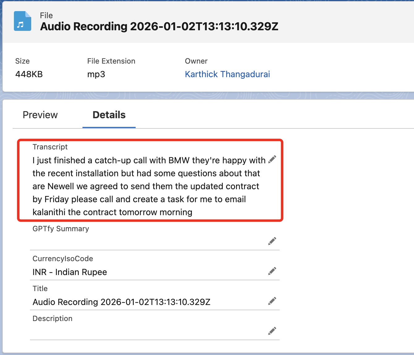 The GPTfy Voice Recorder makes it easy for your sales team to record voice notes directly from Salesforce. These recordings are automatically transcribed using AI and logged to the relevant record saving time and reducing manual effort.