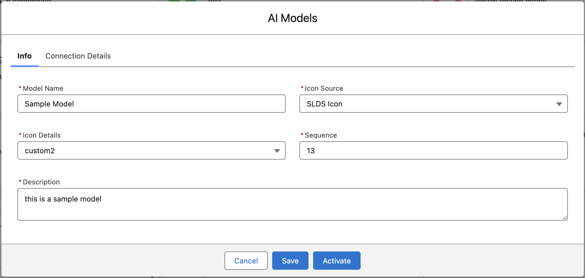- Static Resource: Upload your model’s logo as a static resource and enter its API name in the Icon Details field.