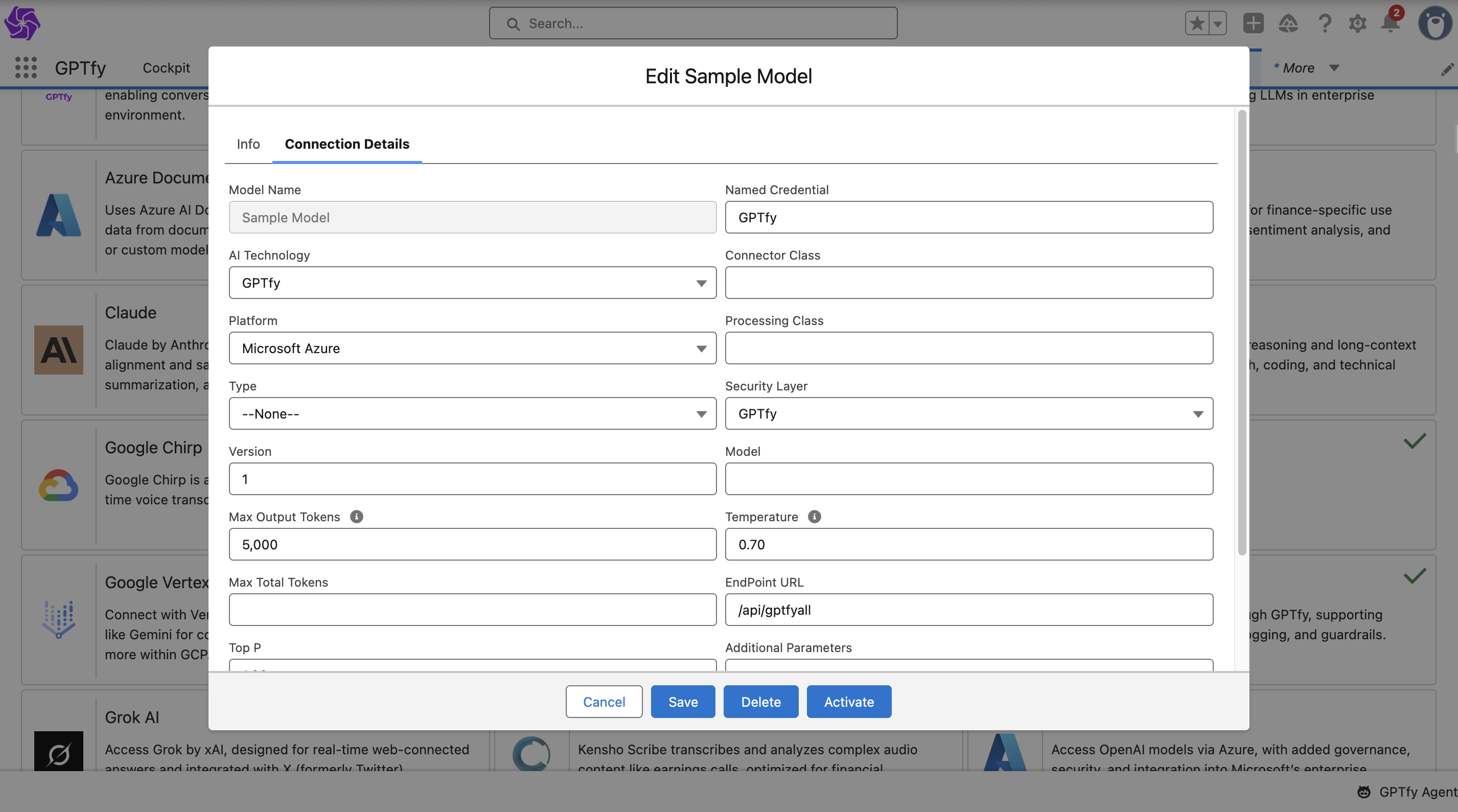 The AI Model record specifies the type of AI that GPTfy will invoke for generating responses. The creation of this AI Model record is a one-time activity.