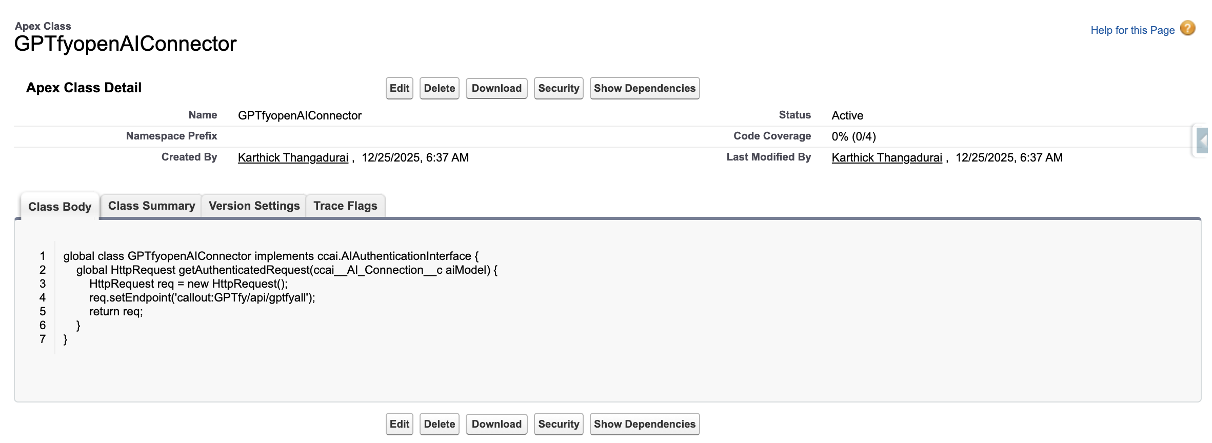 | Named Credential | Use a secure credential (e.g., GPTfy) included in the GPTfy package. |
