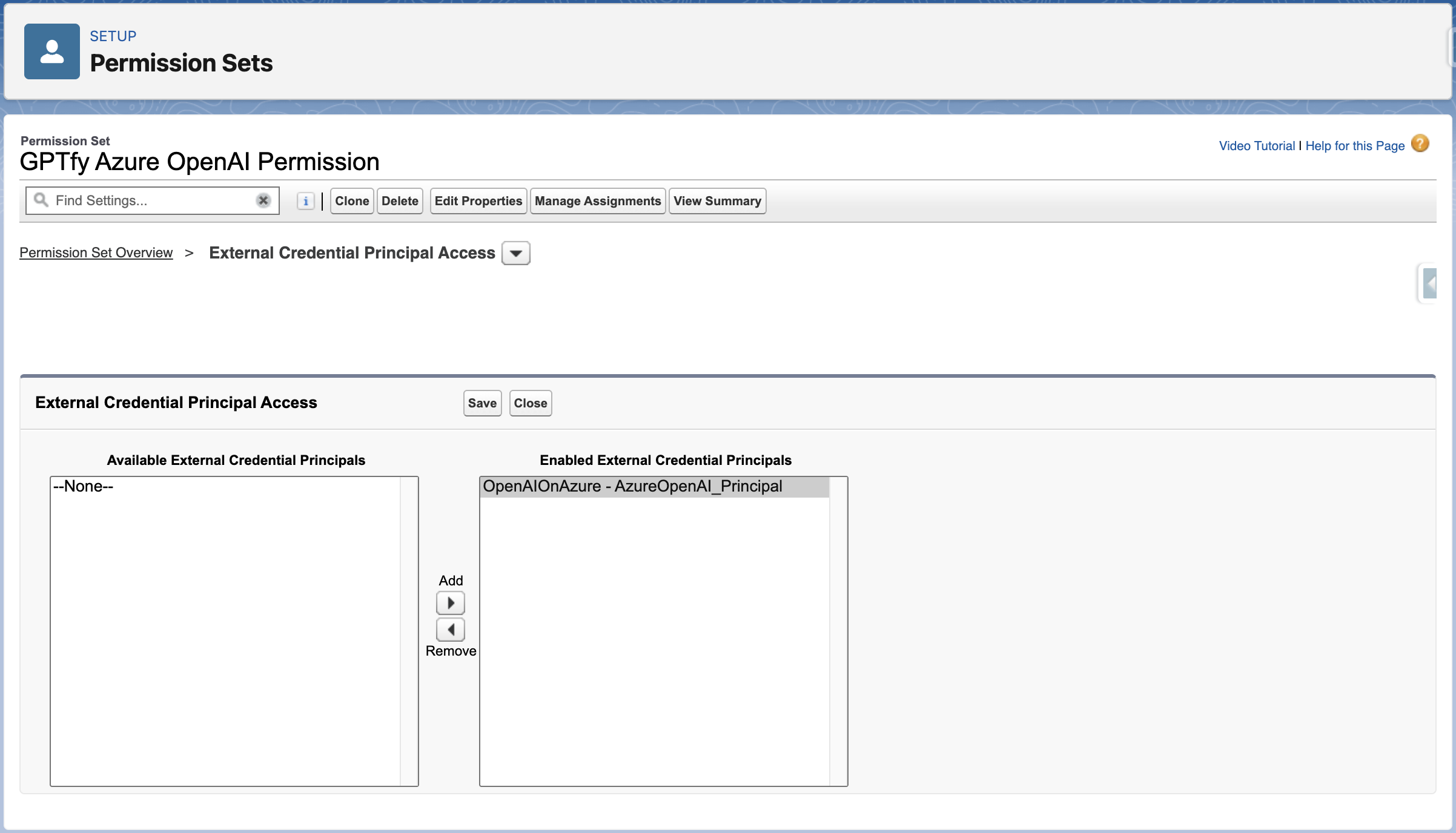 OpenAIOnAzure - AzureOpenAI_Principal) from Available External Credential Principals and move it to Enabled External Credential Principals. Click Save.
