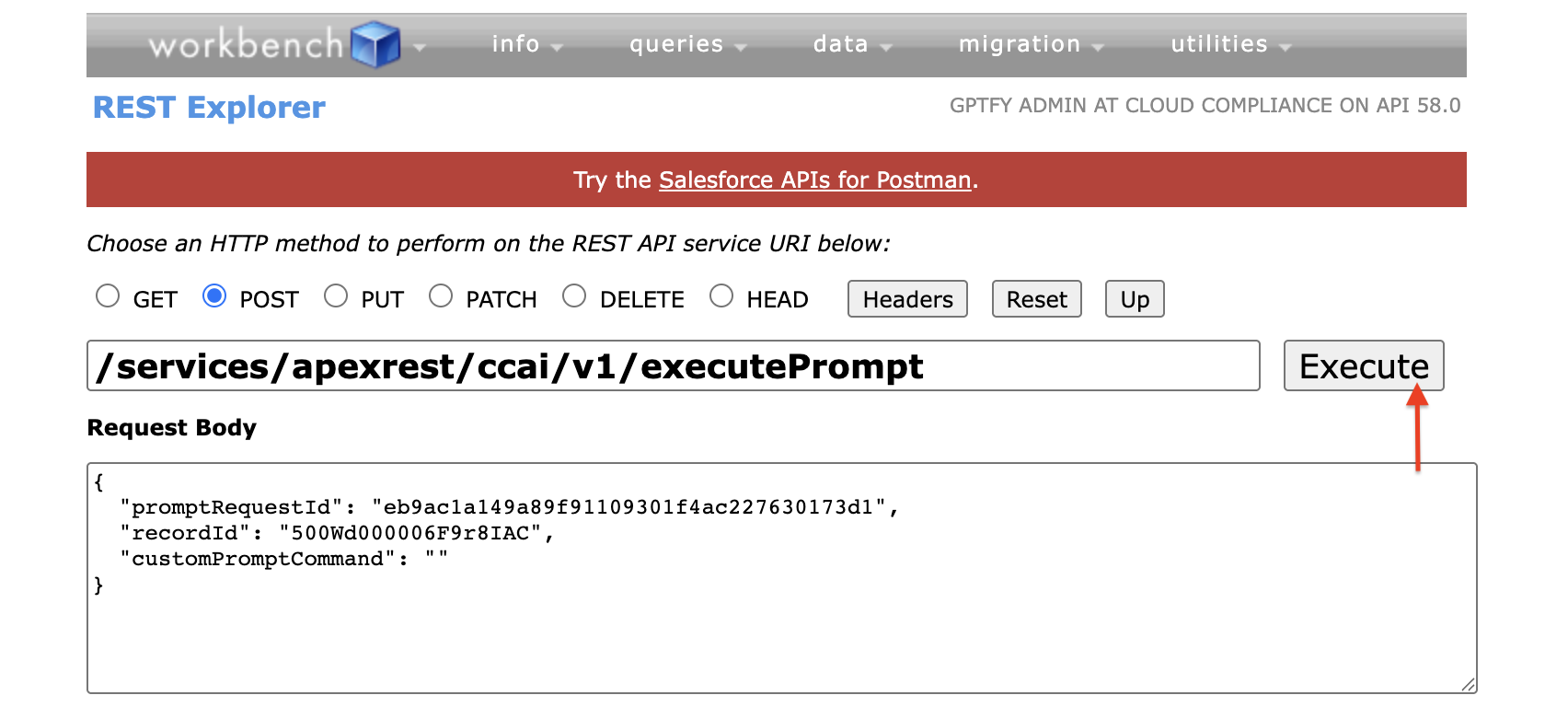 To proceed with the invocation, access any REST tool, such as Salesforce Developer Workbench or Postman. (This example uses Salesforce Developer Workbench.)